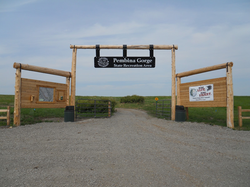 Snowmobilers also find this an exciting vacation spot. The Pembina Gorge Trail System has over 450 miles of state groomed trails. The views along these trails are anything but ordinary. When one thinks of the flat, open lands of the region, these hilly and mountainous areas are breathtaking in the winter season, with warming houses stationed along the trail system. The Pembina Gorge System was developed by the Northeast Snowmobile Club Association. The Northeast Snowmobile Association has an annual ride "The Snowfest", which is always held on the Martin Luther King weekend.