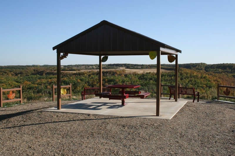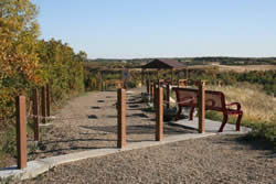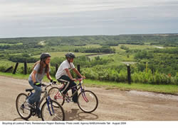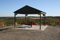 The scenic vista (lookout) has an elevation of 1,155' above sea level. The Vista overlooks the beautiful Pembina River and the Pembina Hills. A beautiful site in the summer and fall, a dirt road for hiking, biking and horseback riding, following the road west will take you to the Tetrault Wood Overlook (this road is not recommended for cars). Parking is available at both scenic overlooks. |
